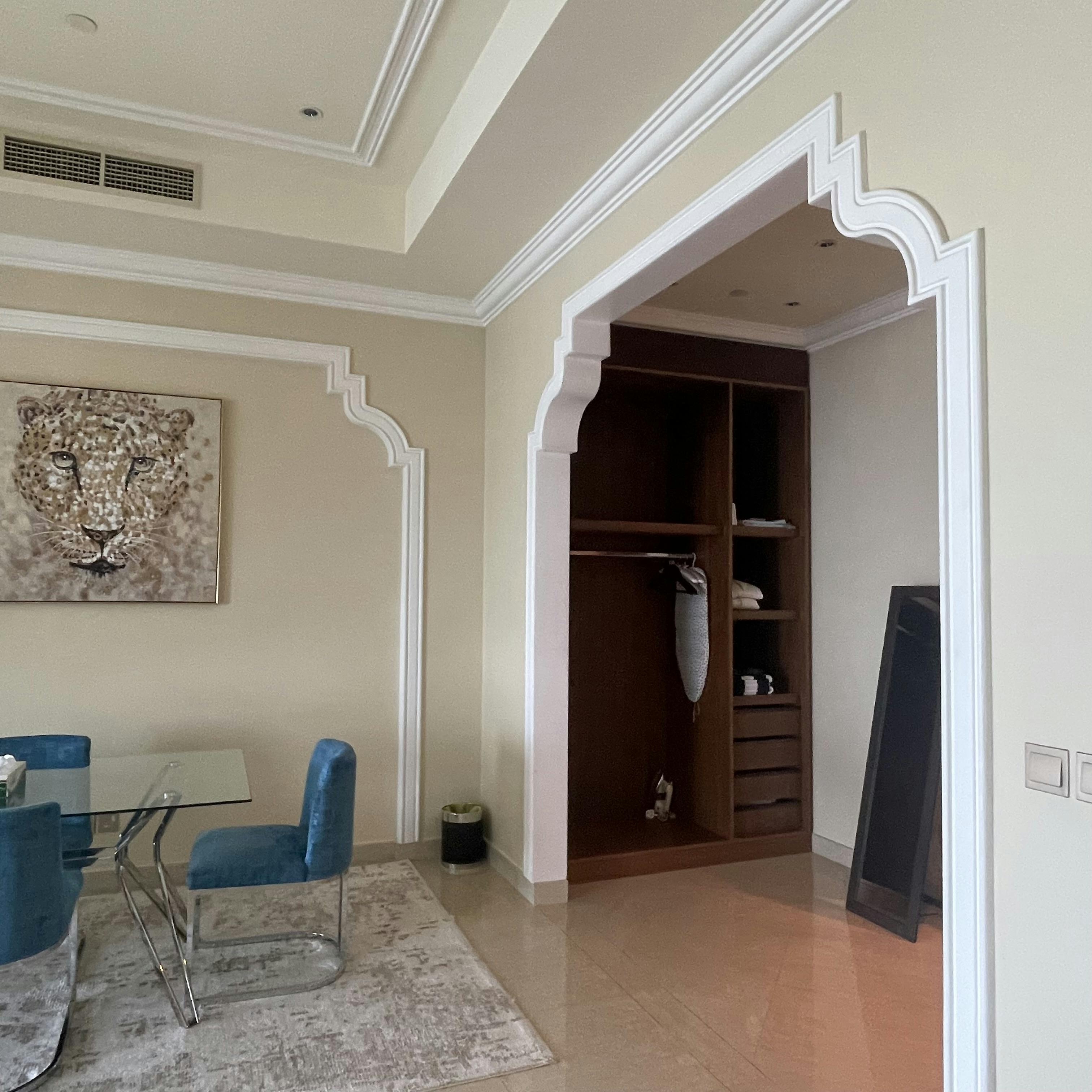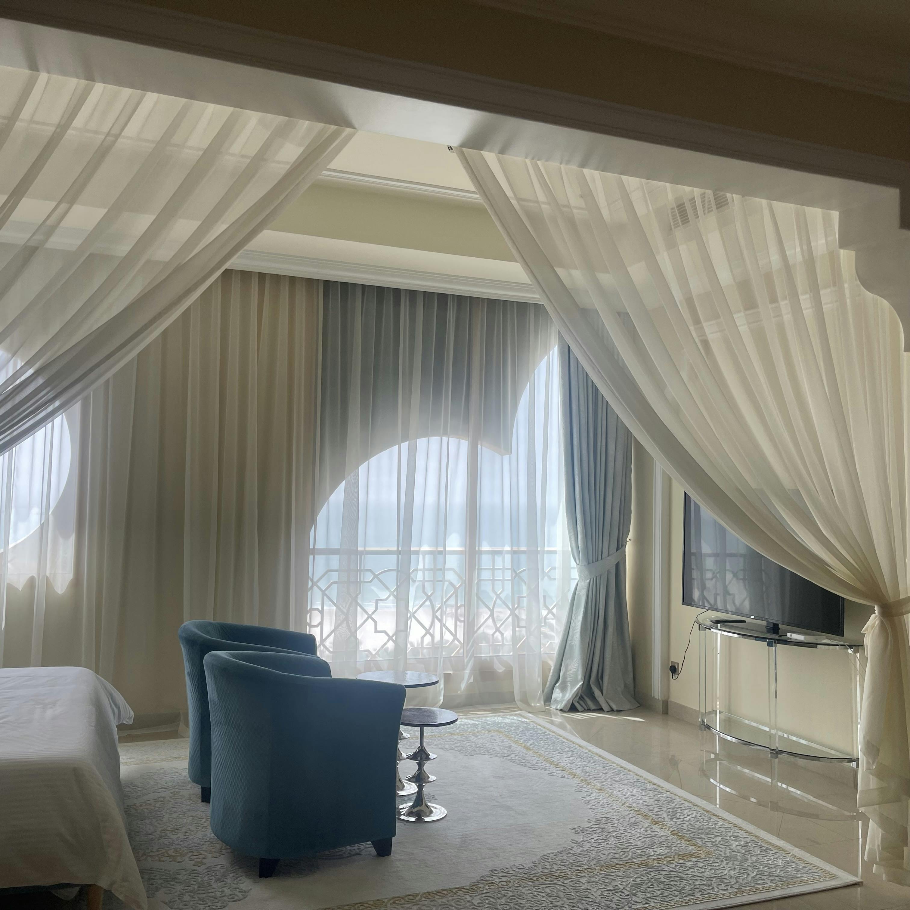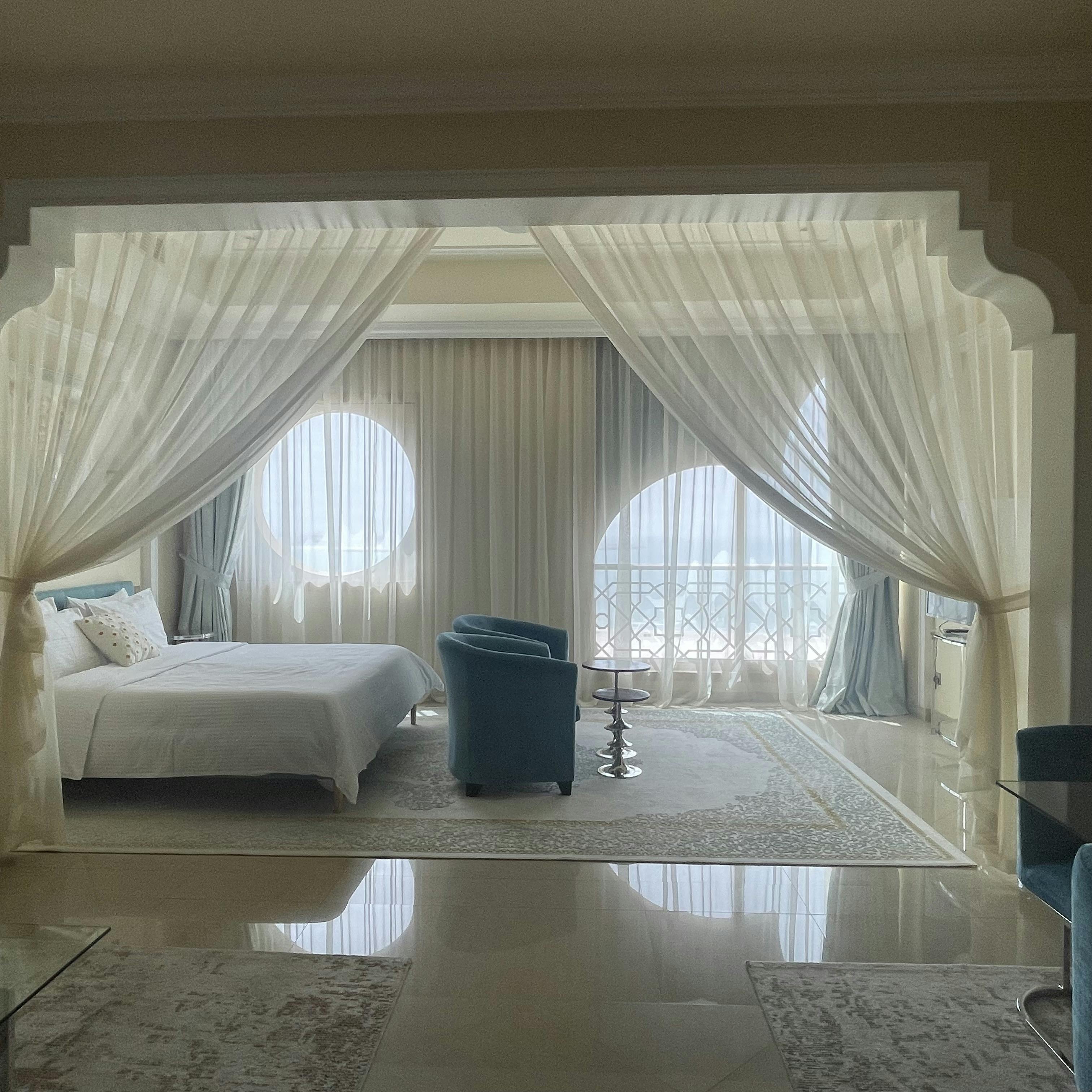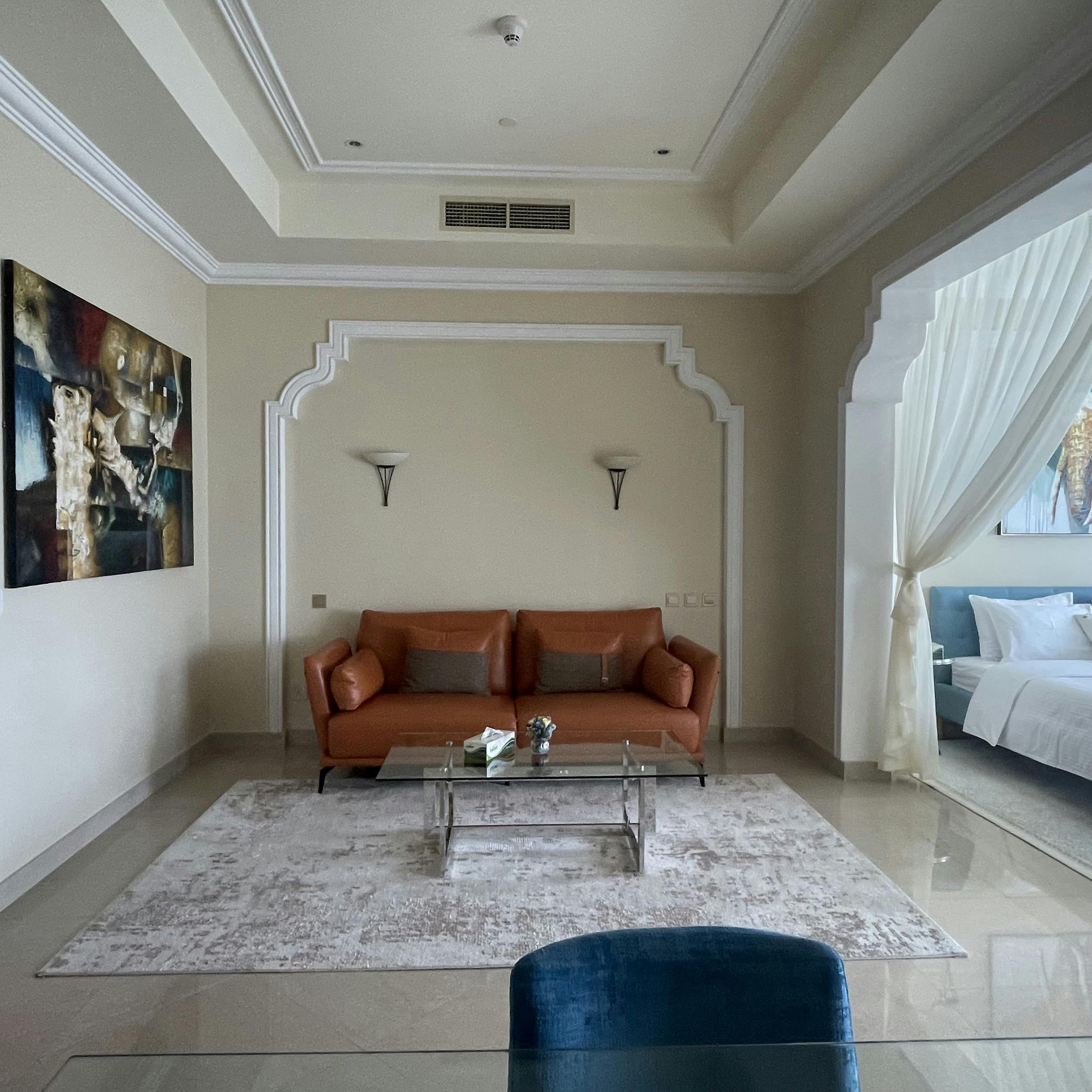 This suite has a full sea view. The bedroom area has a king bed and seating area. The living area has full-size seating and dining zones. Spacious bathroom with bathtub, separate shower enclosure and separate toilet and bidet zone. Separate fully-equipped kitchen.